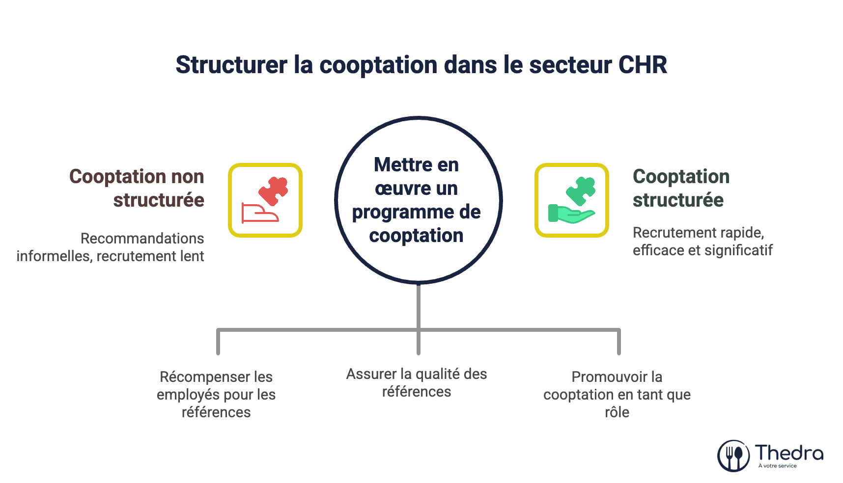 Dans le CHR, la cooptation est un recrutement par recommandation structurée : membres de cuisine, salle ou réception proposent des talents de leur réseau selon des critères définis et avec prime associée. À la clé : embauche plus rapide, intégration plus sûre, turnover et coûts réduits.